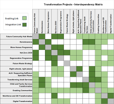 Er mwyn cefnogi hyn, mae'r Bwrdd Trawsnewid Corfforaethol yn defnyddio'r Matrics Rhyngddibyniaeth fel dull byw o olrhain ac asesu'r ffordd mae'r rhaglenni'n rhyngweithio. Mae hyn yn cynnwys achosion pan fyddant yn cael eu galluogi gan adnoddau a rennir, yn dibynnu ar lwybrau cyflawni tebyg, neu'n cyfrannu at ganlyniadau cyffredin. Bu'r matrics yn ddull defnyddiol o ganfod nid yn unig lle mae cynnydd yn atgyfnerthu ei gilydd, ond lle gallai fod gwrthdaro neu risg hefyd.
