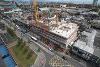 Llun oddi uchod yn dangos y cynnydd yn y gwaith i adeiladu swyddfeydd