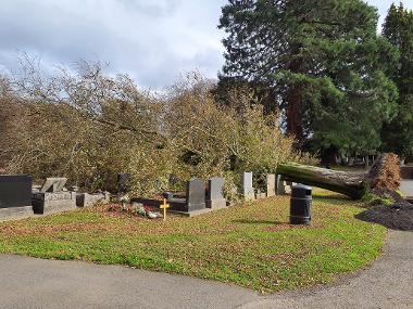 Y Tîm Parciau'n gweithio'n ofalus i gael gwared ar goeden wedi cwympo mewn mynwent leol